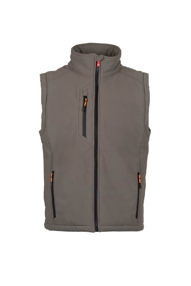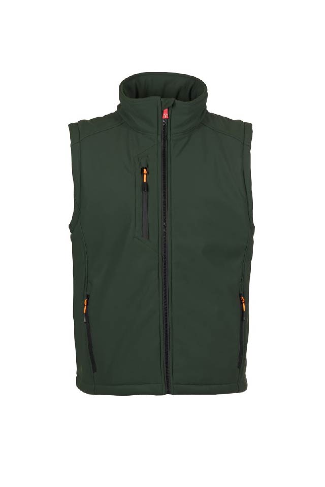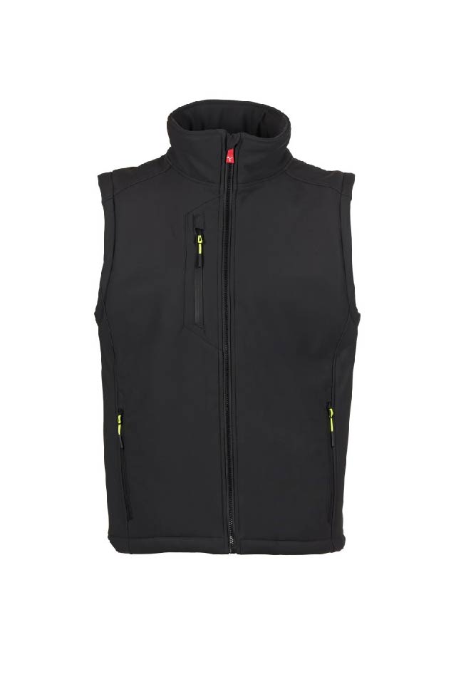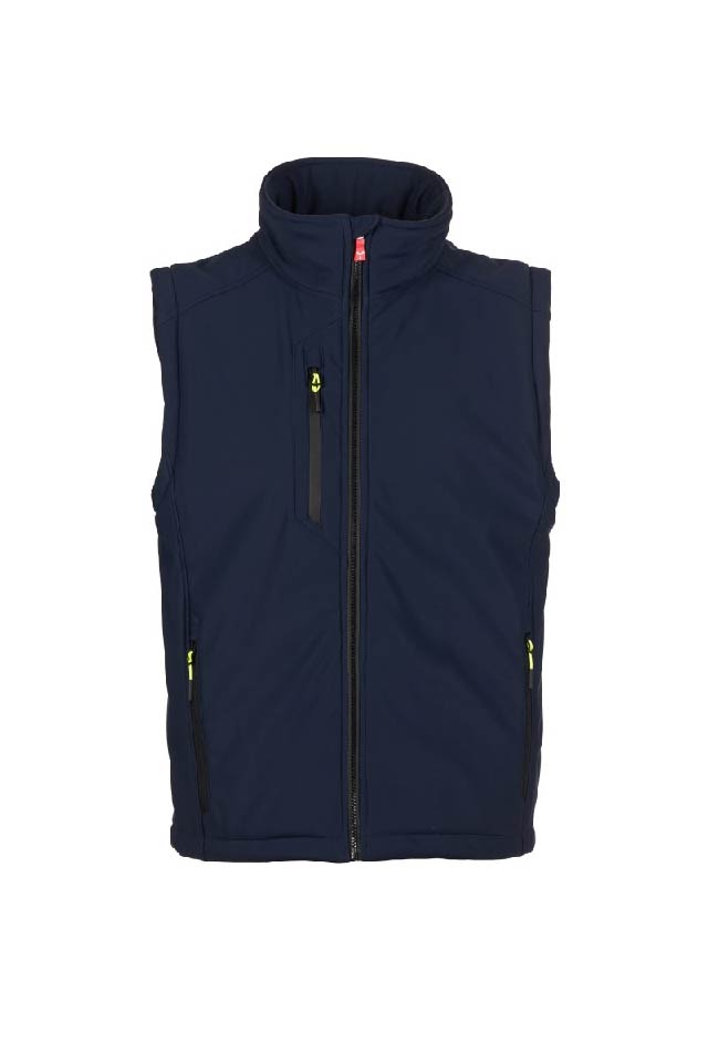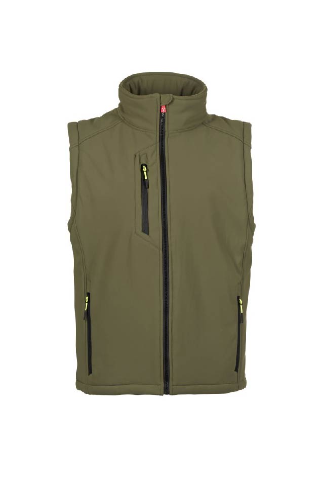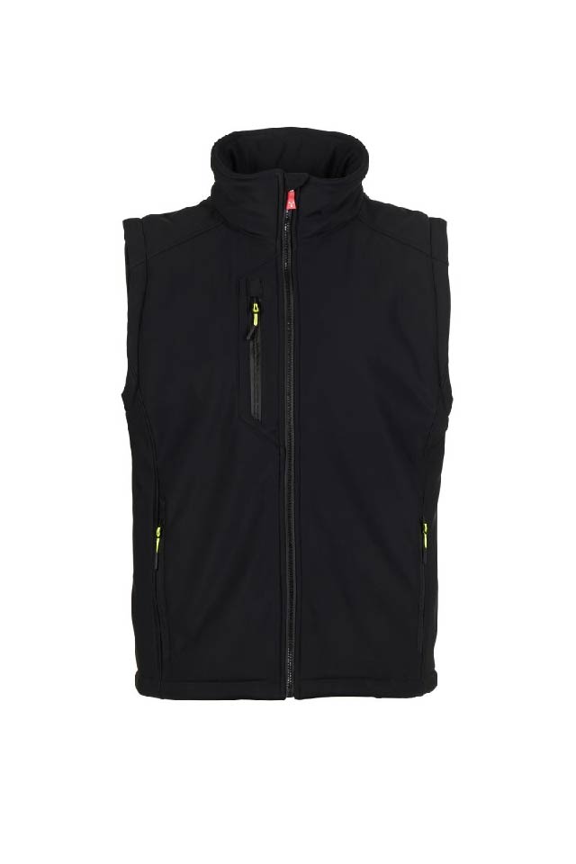 WP 8000 mm H₂O, WVT 5000 g/m² 24h. Gilet soft-shell 3 strati, dalla calda imbottitura (160g/m²), da uomo, collo con inserti in pile, chiusura tramite zip SBS con cursore in metallo "semi-auto lock" e tiretto personalizzato. Colletto interno con dettagli laterali in pile. Banda retroriflettente su fondoschiena. Due tasche laterali con zip, una tasca al petto con zip spalmata. Tiretti fluorescenti. Una tasca a filetto interna, con chiusura a strappo. Fondo regolabile con stopper personalizzati.
