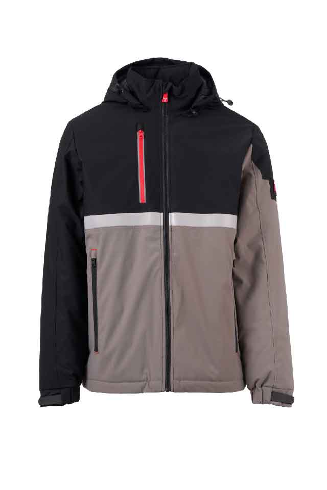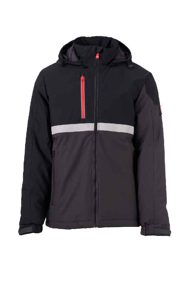 WP 8000 mm H₂O, WVT 5000 g/m² 24h. Soft-shell 3 strati, dalla media imbottitura (140g/m²), da uomo, chiusura tramite zip SBS con cursore in metallo "semi-auto lock" e tiretto personalizzato. Cappuccio removibile, con coulisse regolabile. Banda retroriflettente frontale su torace. Polsini elasticizzati, regolabili con strappo e polsino interno. Due tasche laterali con zip e una tasca al petto chiusa con zip dal dettaglio retroriflettente. Elemento "Life-saving" sul retro, con logotipo interno retroriflettente, chiuso con zip. Due tasche interne, di cui una sagomata con zip sul petto destro ed una porta tablet con chiusura a strappo a sinistra. Fondo regolabile con stopper personalizzati.