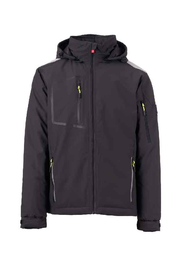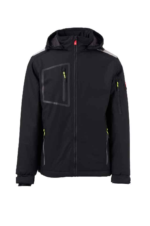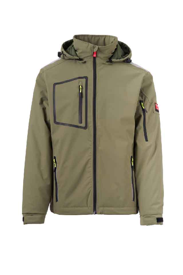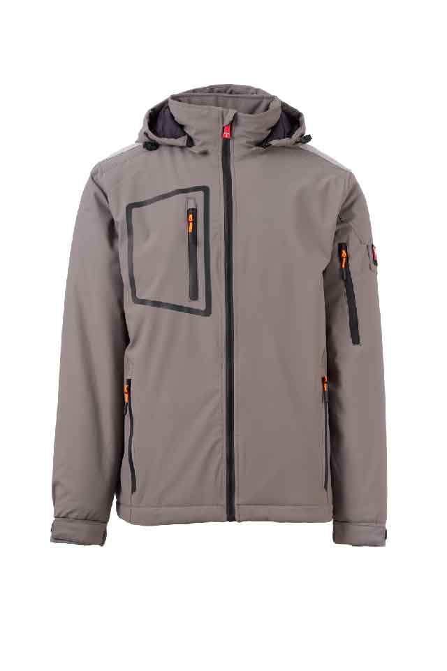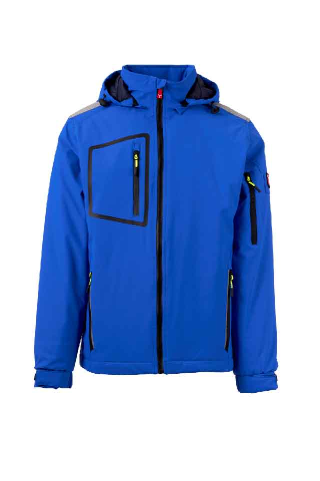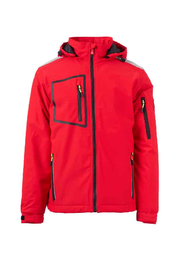 WP 8000 mm H₂O, WVT 5000 g/m² 24h. Soft-shell 3 strati, dalla media imbottitura (140g/m²), da uomo, chiusura tramite zip SBS con cursore in metallo "semi-auto lock" e tiretto personalizzato. Cappuccio removibile, con coulisse regolabile. Bande retroriflettente su spalle, fondoschiena e retro cappuccio. Polsini elasticizzati, regolabili con strappo e manicotto interno. Tasca termosaldata sul petto, chiusa con zip spalmata. Due tasche laterali, chiuse con zip dal dettaglio retroriflettente. Tasca sul braccio sinistro con porta penne integrato, chiusa con zip. Tiretti fluorescenti. Due tasche interne, di cui una sagomata con zip sul petto destro ed una porta tablet con chiusura a strappo a sinistra. Fondo regolabile con stopper personalizzati.