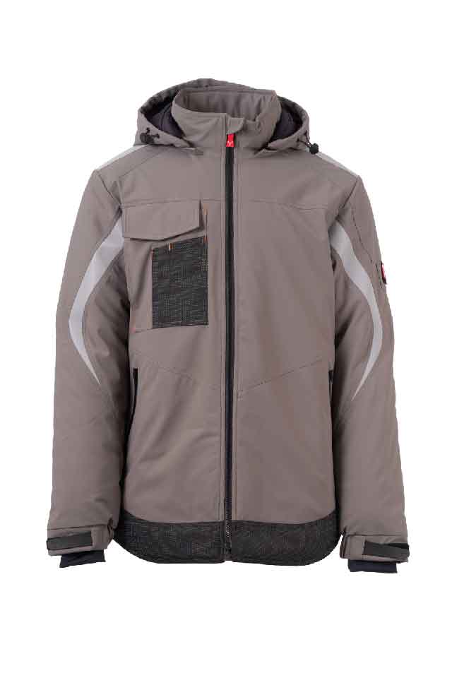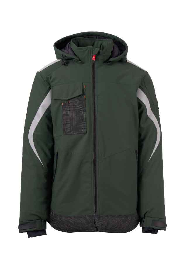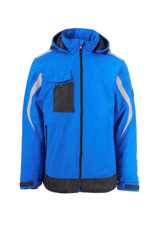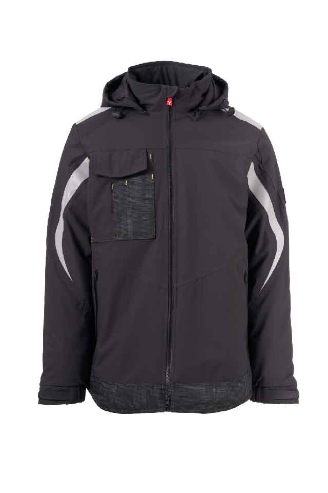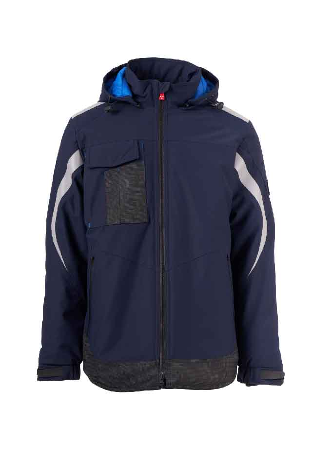 WP 8000 mm H₂O, WVT 5000 g/m² 24h. Soft-shell 3 strati, dalla media imbottitura (140g/m²), da uomo, chiusura tramite zip SBS con cursore in metallo "semi-auto lock" e tiretto personalizzato. Cappuccio removibile, con coulisse regolabile. Nastro retroriflettente su spalle e braccia. Polsini elasticizzati, regolabili con strappo e polsino interno. Tasca al petto Lock System con pattina, porta badge e porta penne. Due tasche laterali chiuse con zip dal nastro spalmato. Elemento "Life-saving" sul retro con logotipo interno retroriflettente, chiuso con zip spalmata. Due tasche interne, di cui una sagomata con zip sul petto destro ed una porta tablet con chiusura a strappo a sinistra. Fondo regolabile con stopper personalizzati. Tessuto puntinato con effetto retroriflettente.